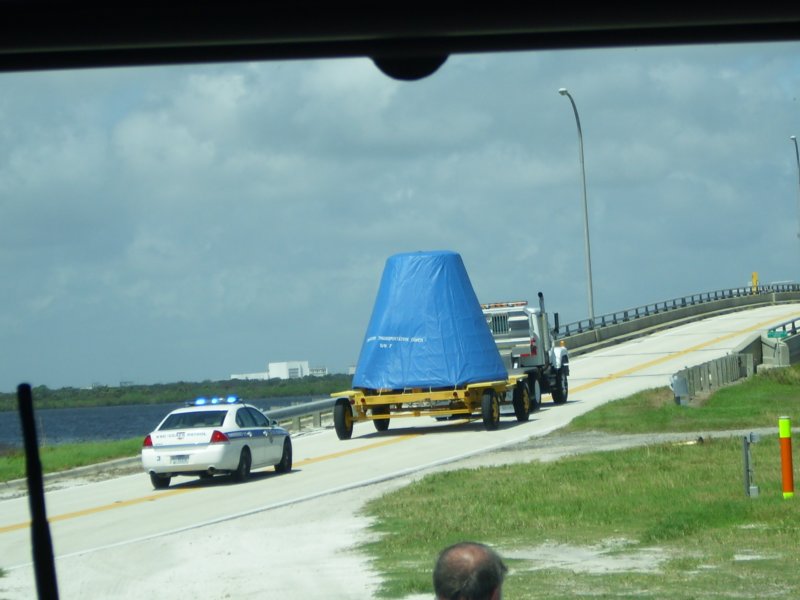 Mock-up of the Orion space capsule. Based on a "stretched limo" Apollo design, this will take 6 crew to Earth Orbit, or 4 to the Moon.