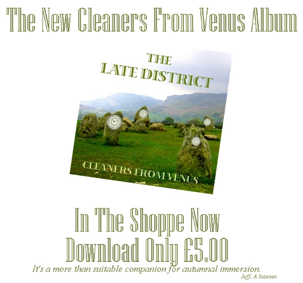 Current Online Shop Stock List Return To BohemiaReleased online in May 2014Recorded on a Tascam Pocketstudio using real musical instruments. Twelve new high quality songs.Please email Martin to tell him you bought it and donate Six Pounds (GBP) via Paypal and Martin will send you the download link. If you don't hear back in a few hours then email Paul.temporary artworkTHE LATE DISTRICTnew album from The Cleaners From Venus 2012Available to downloadFive pounds please.It's here, it's ginchy